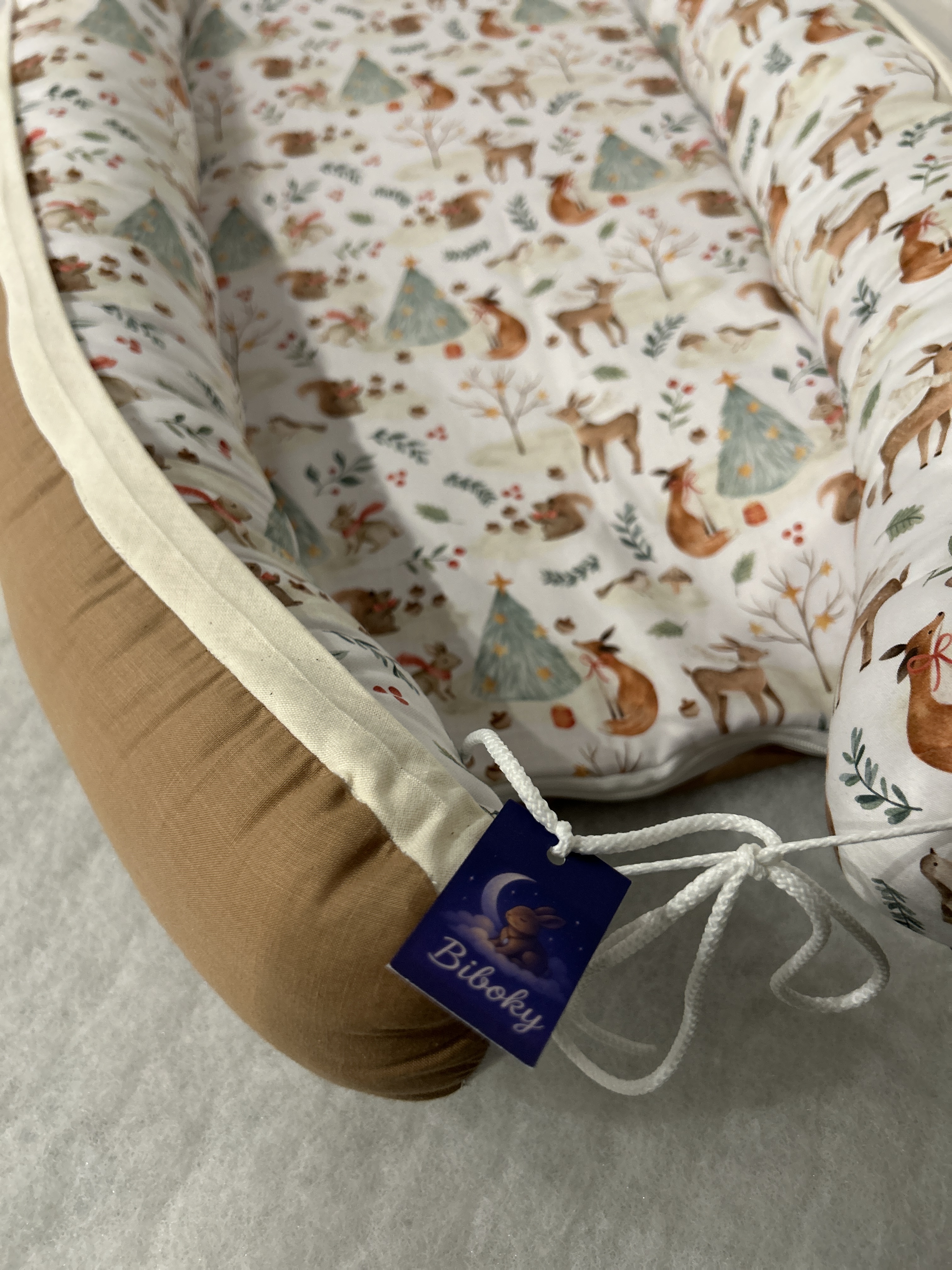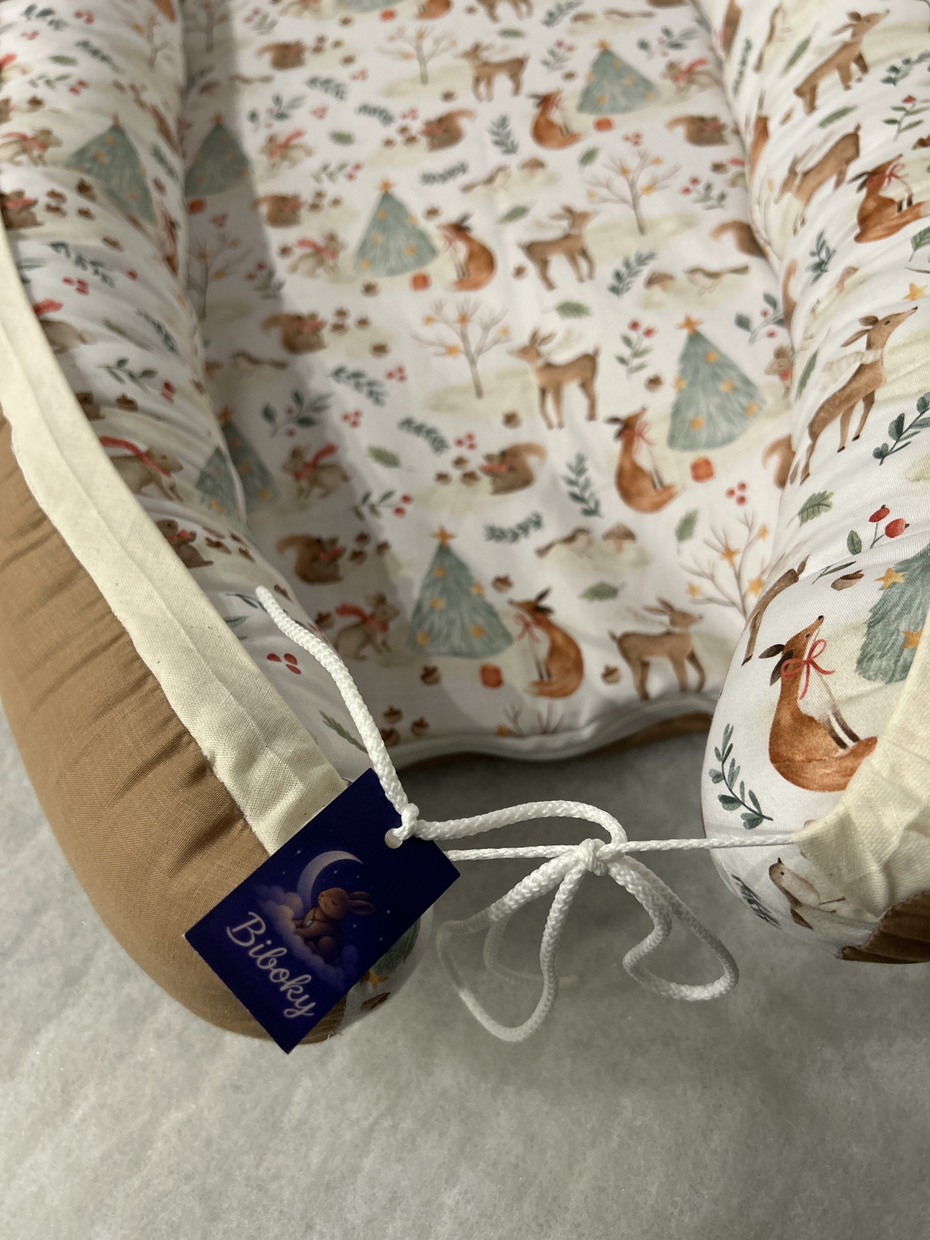 A babafészek külső borítása prémium minőségű pamutvászonból készült, amely puha tapintású, légáteresztő és kíméletes a baba érzékeny bőréhez.