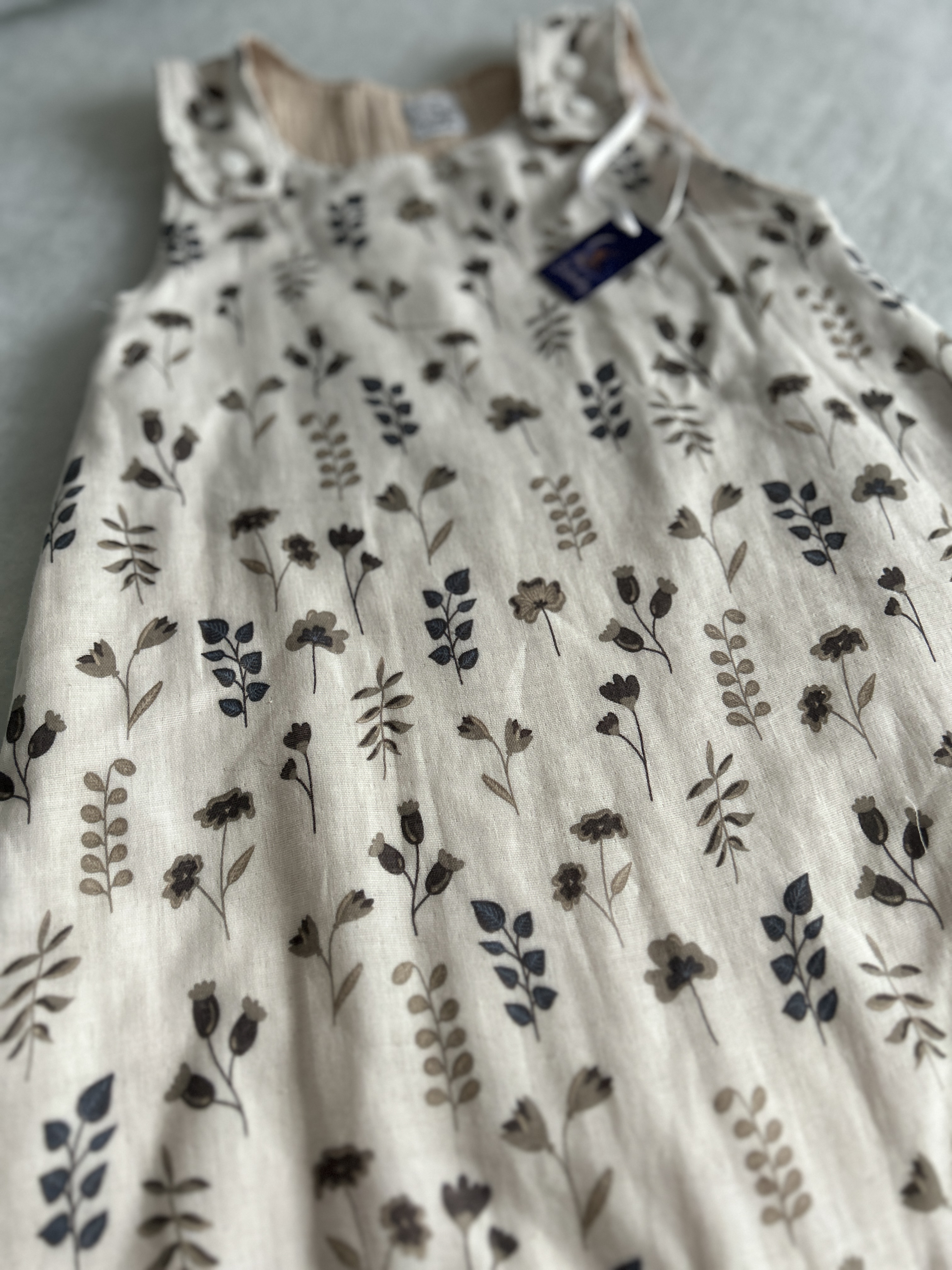 Pamutvászonból készült, egy cipzáras és egy sima zsebbel. Popsi törlő tartóval.