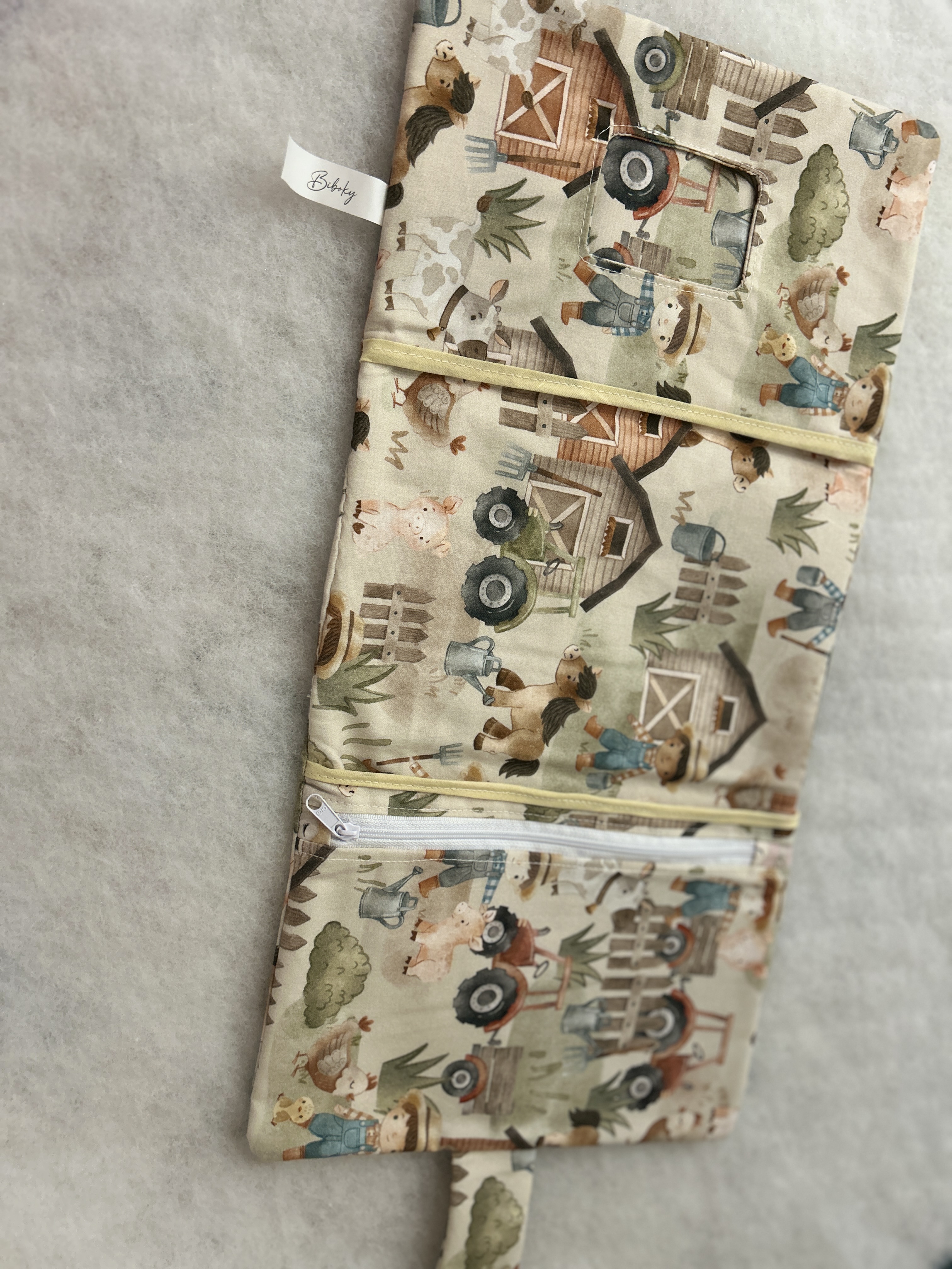 Pamutvászonból készült, egy cipzáras és egy sima zsebbel. Popsi törlő tartóval.
