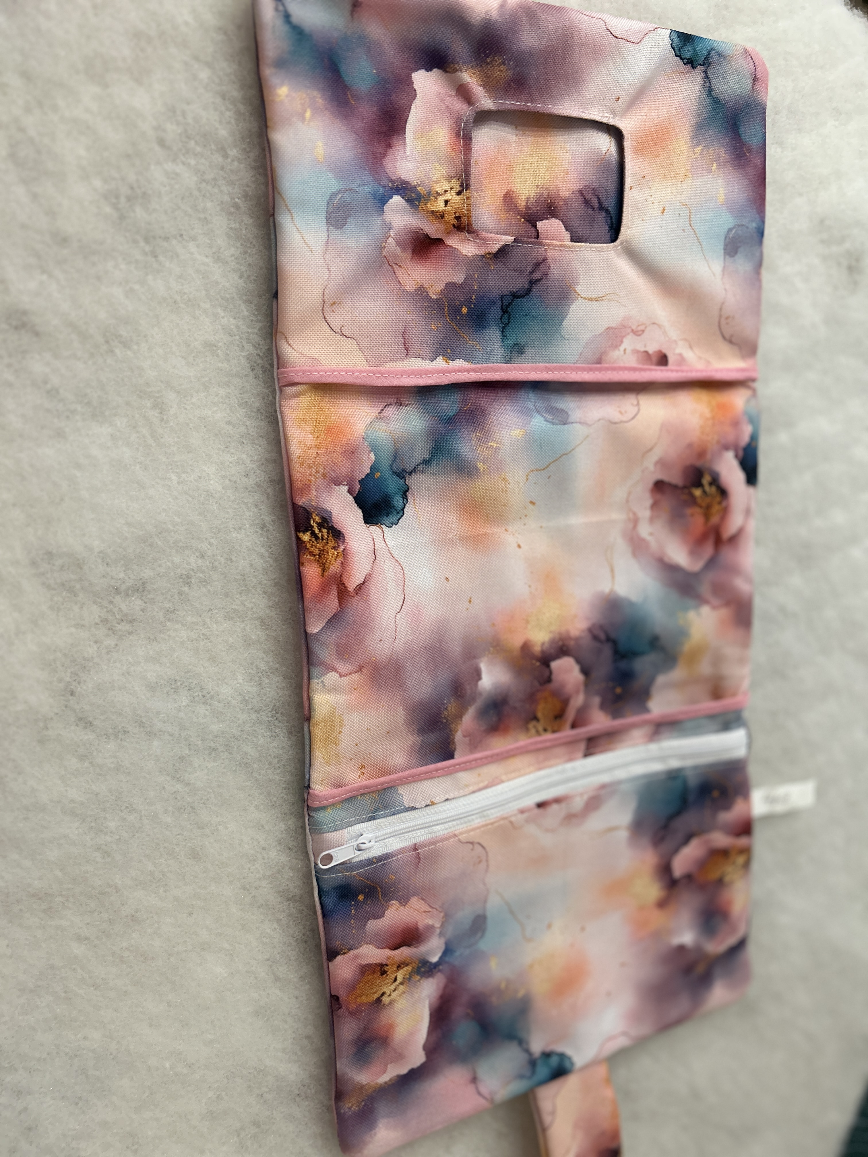 Vízlepergetős anyagból készült, egy cipzáras és egy sima zsebbel. Popsi törlő tartóval.